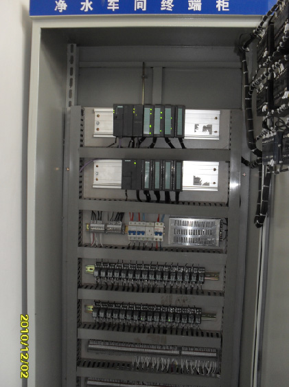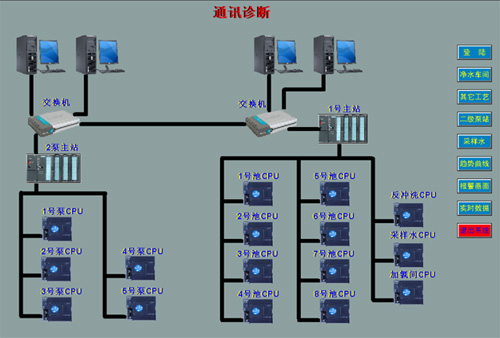 (1)、分凈水車間控制系統、二級泵站車間控制系統、加氯間和清水池和反沖池等公共工藝控制系統 (2)、1、控制思想: 中央控制室主要負責凈水廠所有全部自動化儀表和設備的實時數據采集和啟動和停止,具有最高控制權限; 2、凈水車間控制室主要負責采集:控制水廠凈水車間全部自動化設備并向中央控制室提供實時數據; 3、二級泵站控制室主要負責采集:控制水廠二級泵站全部自動化設備并向中央控制室提供實時數據。 4、取水泵站終端控制箱主要負責采集:控制水廠取水泵站全部自動化設備并向中央控制室提供實時數據。 5、三個終端控制柜將現場所有信號采集設備和泵、閥控制柜自動控制部分分別集中到三個中央處理器中;并通過光纖、總線傳輸路徑又分別送到二級泵站、凈水車間、中央控制室,進行數據處理和控制功能。